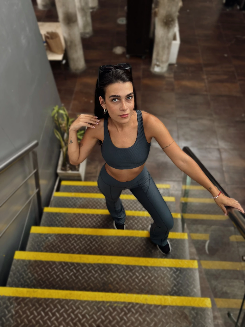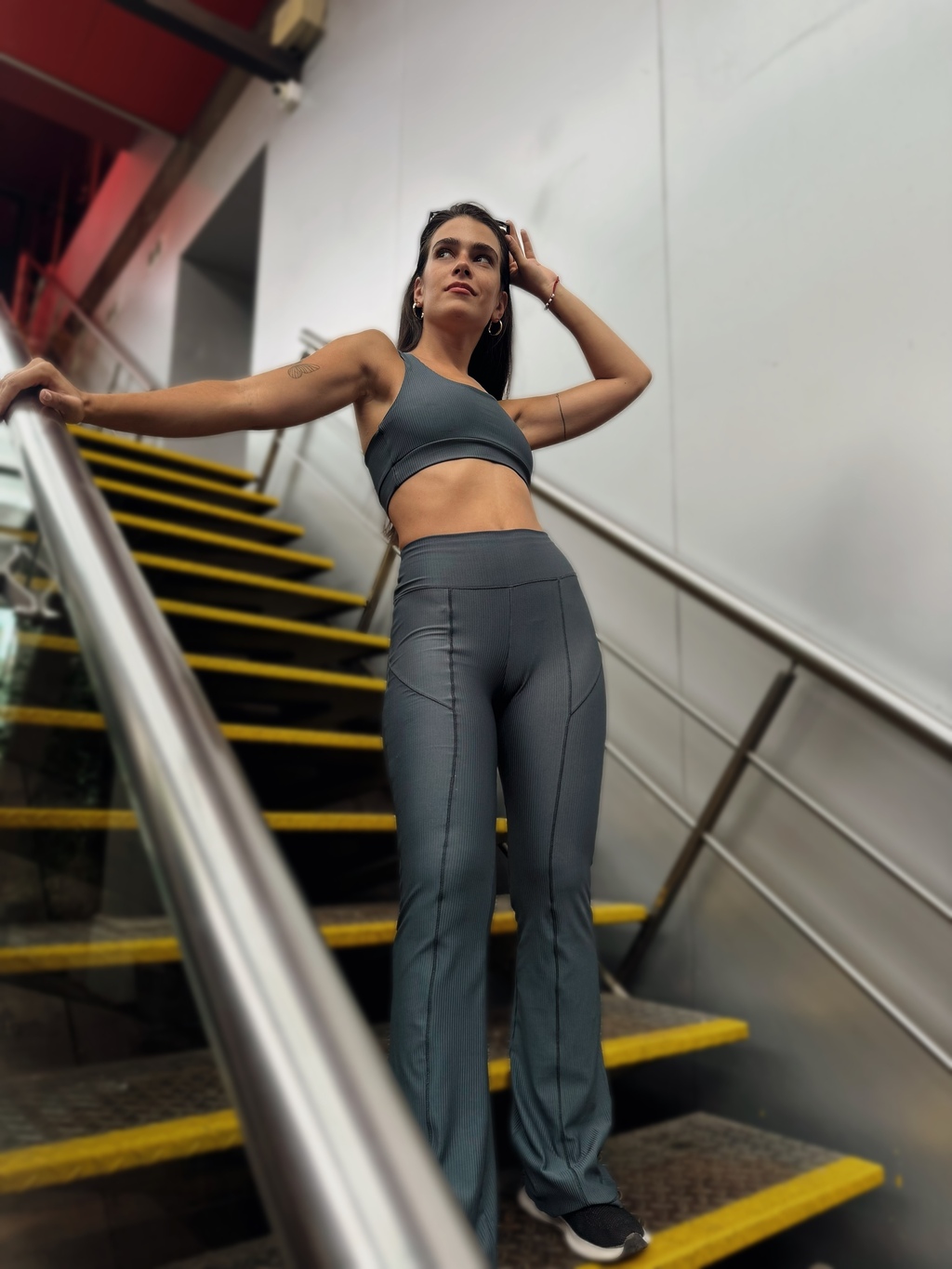 Calza tiro alto con pretina ancha y al cuerpo. Como detalle podemos destacar la terminacion en oxford del pantalón de Morley. Tejido de punto elástico con doble rebote y textura de bastones verticales; está compuesta principalmente de fibra de spandex, lo que permite su excelente elasticidad y capacidad de recuperación. Esta caracteristica permite que la tela se ajuste perfectamente al cuerpo, ofreciendo una gran libertad de movimiento y comodidad.